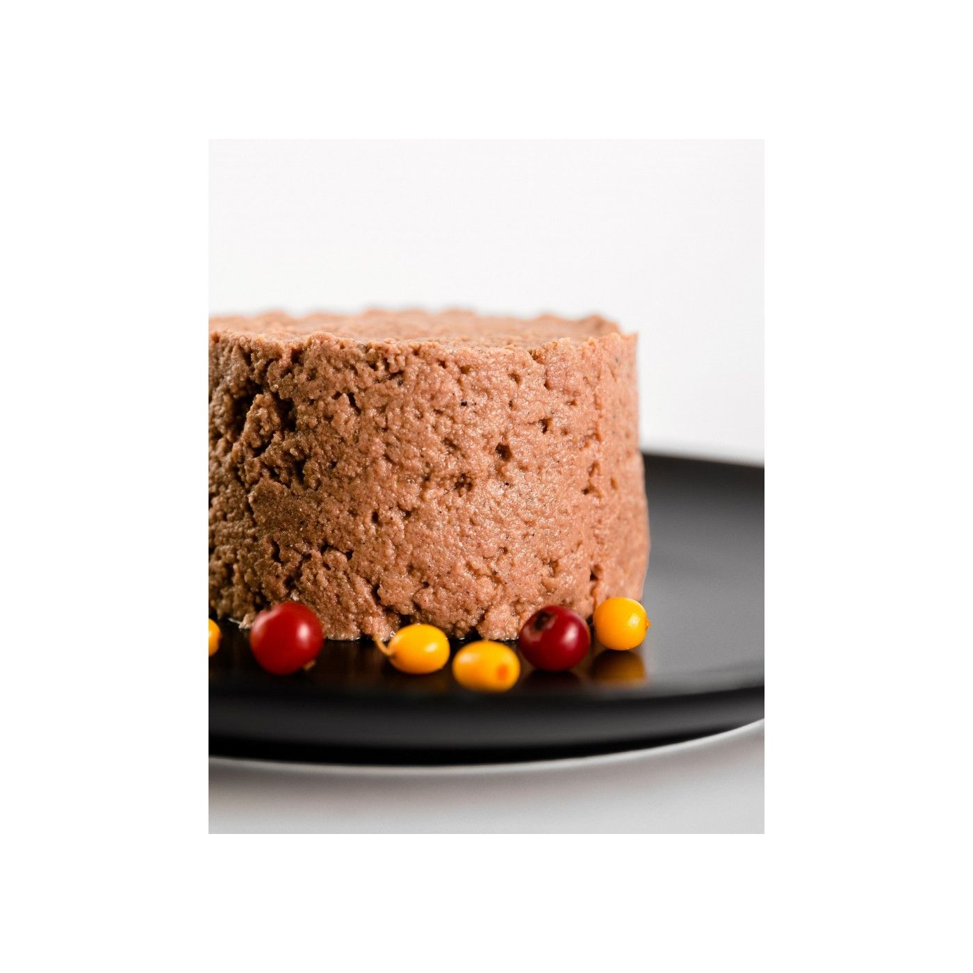 Склад: качка (36%), курячі шлунки (14%), курячі серця (14%), печінка (12%), горохове борошно, лігноцелюлоза (органічна клітковина), карбонат кальцію, сушена журавлина (контроль pH сечі) (0,1%), сушена обліпиха (0,1%), сушена котяча м’ята (антистресовий ефект) (0,1%).