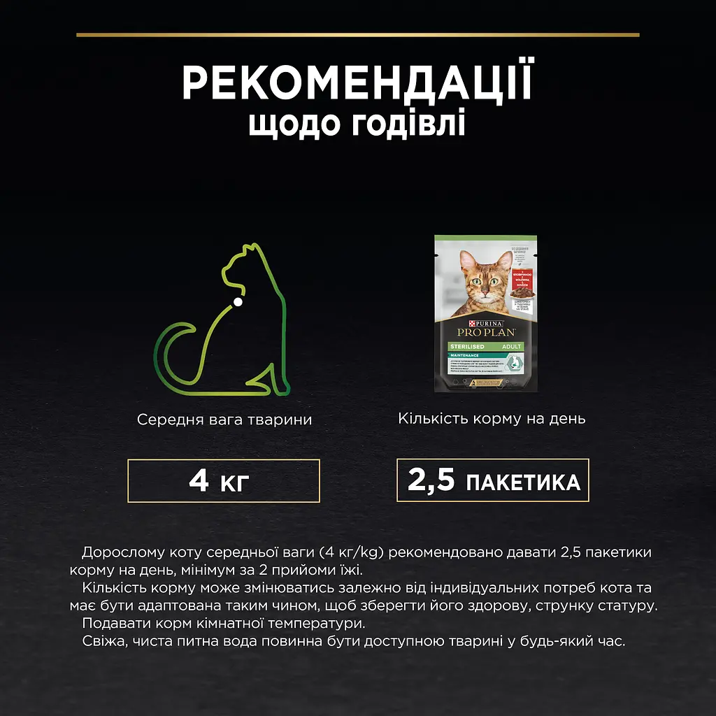 - Дорослому коту середньої маси тіла (4 кг) рекомендовано давати 2,5 пакетика корму на день щонайменше за 2 прийоми їжі.