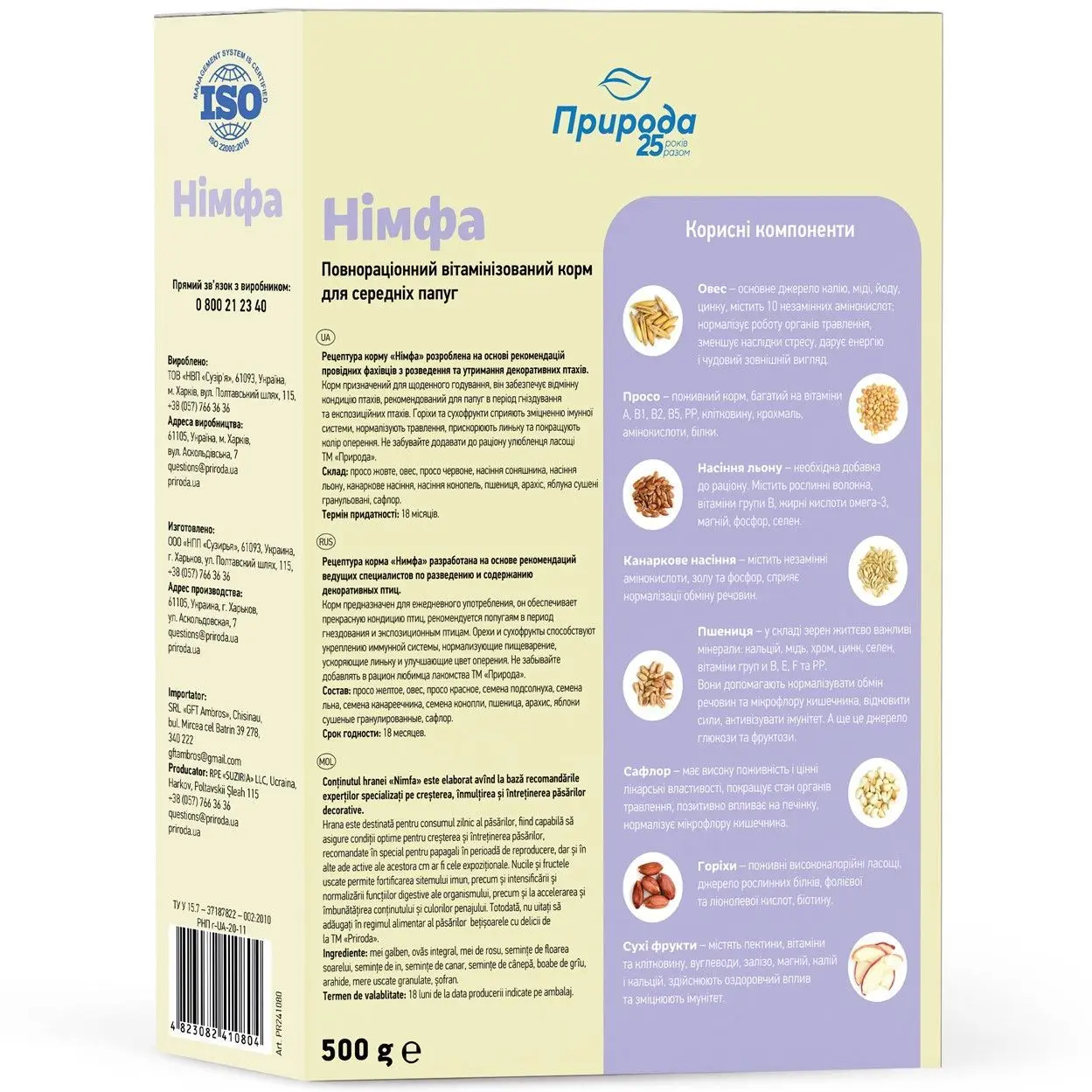 Рецептура корму Природа Німфа для середніх папуг розроблена на основі рекомендацій провідних фахівців з розведення та утримання декоративних птахів. Корм призначений для щоденного годування, він забезпечує відмінну кондицію птахів, рекомендований для папуг в період гніздування та експозиційних птахів.