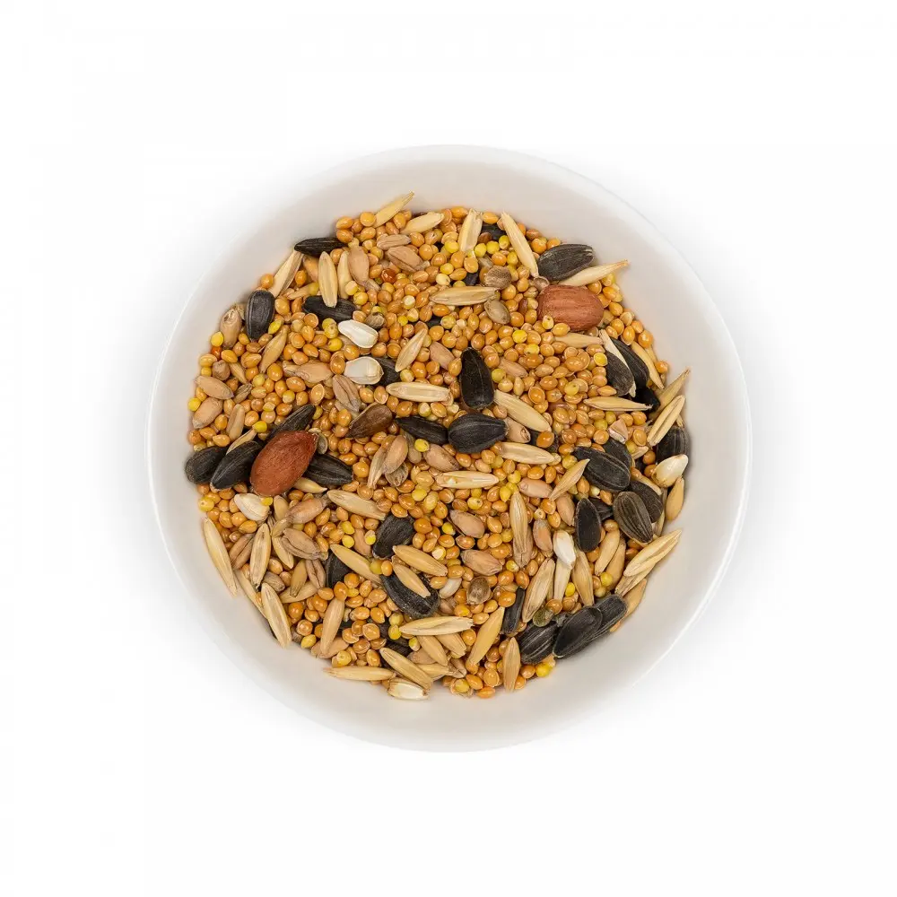 Кормова суміш містить відбірне зерно та природні біостимулятори – подрібнені горіхи та сухофрукти, вітаміни та мінеральні речовини, які сприяють зміцненню імунної системи, нормалізують травлення, прискорюють линьку та покращують колір оперення декоративних птахів.
