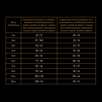 Вітаміни та мінеральні речовини: вітаміни А, D3; мінеральні речовини (мг/кг): залізо 145; кальцій 2,4; мідь: 35; марганець: 15; цинк 182, натрій 0,23; таурін 870 мг/кг