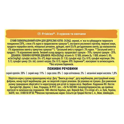 Сухий корм для котів Friskies – це повнораціонне харчування для вашого улюбленця на кожен день. Цей корм забезпечує вашого котика необхідними речовинами та чудовим смаком, який він так любить, щоб допомагати йому залишатися здоровим і щасливим.