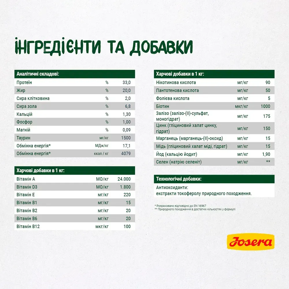 Протеїн 33.0%, жир 20.0%, сира клітковина 2.0%, сира зола 6.8%, кальцій 1.30%, фосфор 1.00%, магній 0.09%, таурин 1500 мг/кг, обмінна енергія 17.1 МДж/кг, 4079 ккал/кг.