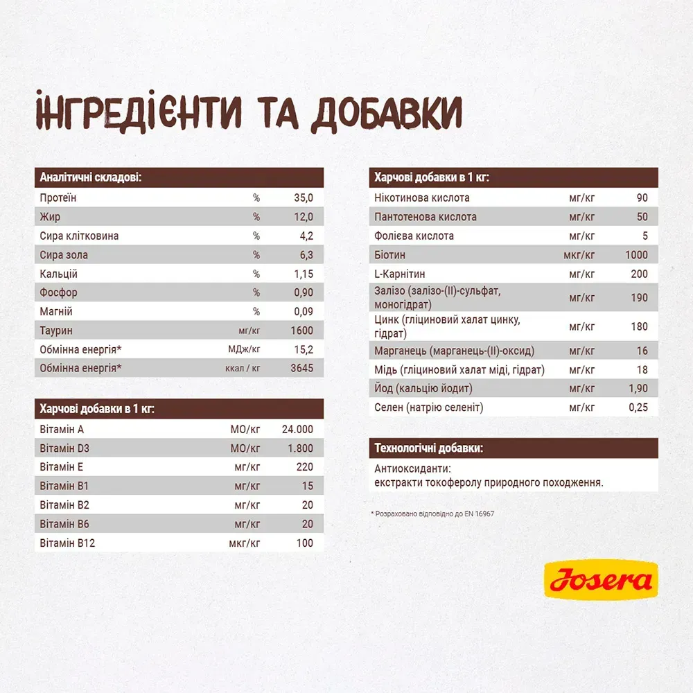 - Корм Josera Naturelle не містить штучних барвників, консервантів та ГМО, що робить його безпечним та здоровим вибором для вашого улюбленця.