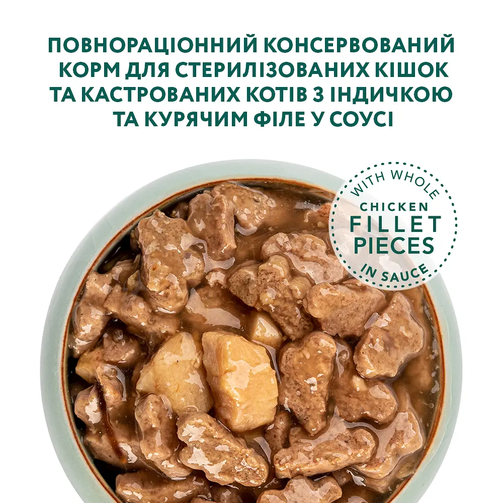 Набір вологого корму для стерилізованих кішок та кастрованих котів Optimeal з індичкою та курячим філе в соусі забезпечить збалансований раціон з багатим вмістом поживних компонентів.