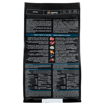 Сухий корм для кошенят Savory містить свіже м’ясо індички та дегідратоване м’ясо курки, ягоди, фрукти та овочі. Ці компоненти створені природою, щоб організм малюків отримав необхідні поживні речовини для зміцнення імунітету, правильного розвитку та здорового зростання.