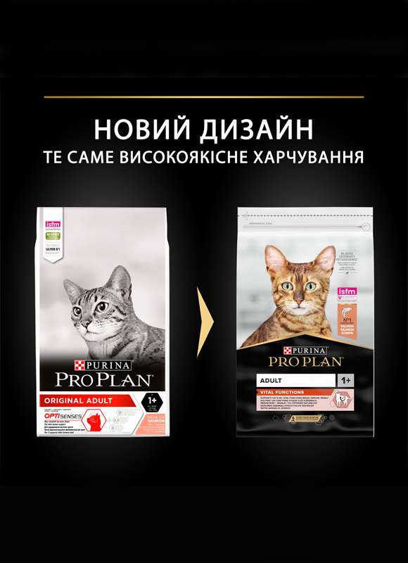 Склад: м’ясо та продукти тваринного походження (74% у шматочках), риба та продукти рибного походження (з яких 4 % лосось), овочі (1% дегідрованого гороху, що еквівалентно 4% гороху), продукти рослинного похождення, екстракт рослинного білка, мінерали, цукри