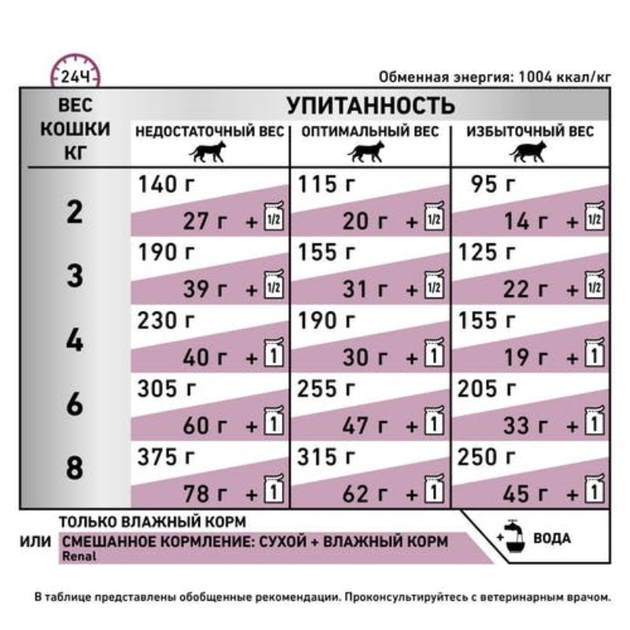 Середня добова норма розрахована для помірно активних котів за нормальної температури оточуючого середовища. Коригуйте добову норму відповідно до погодних умов, активності, фізичного стану та індивідуальних потреб тварини. Свіжа чиста питна вода повинна бути доступною тварині у будь-який час.
