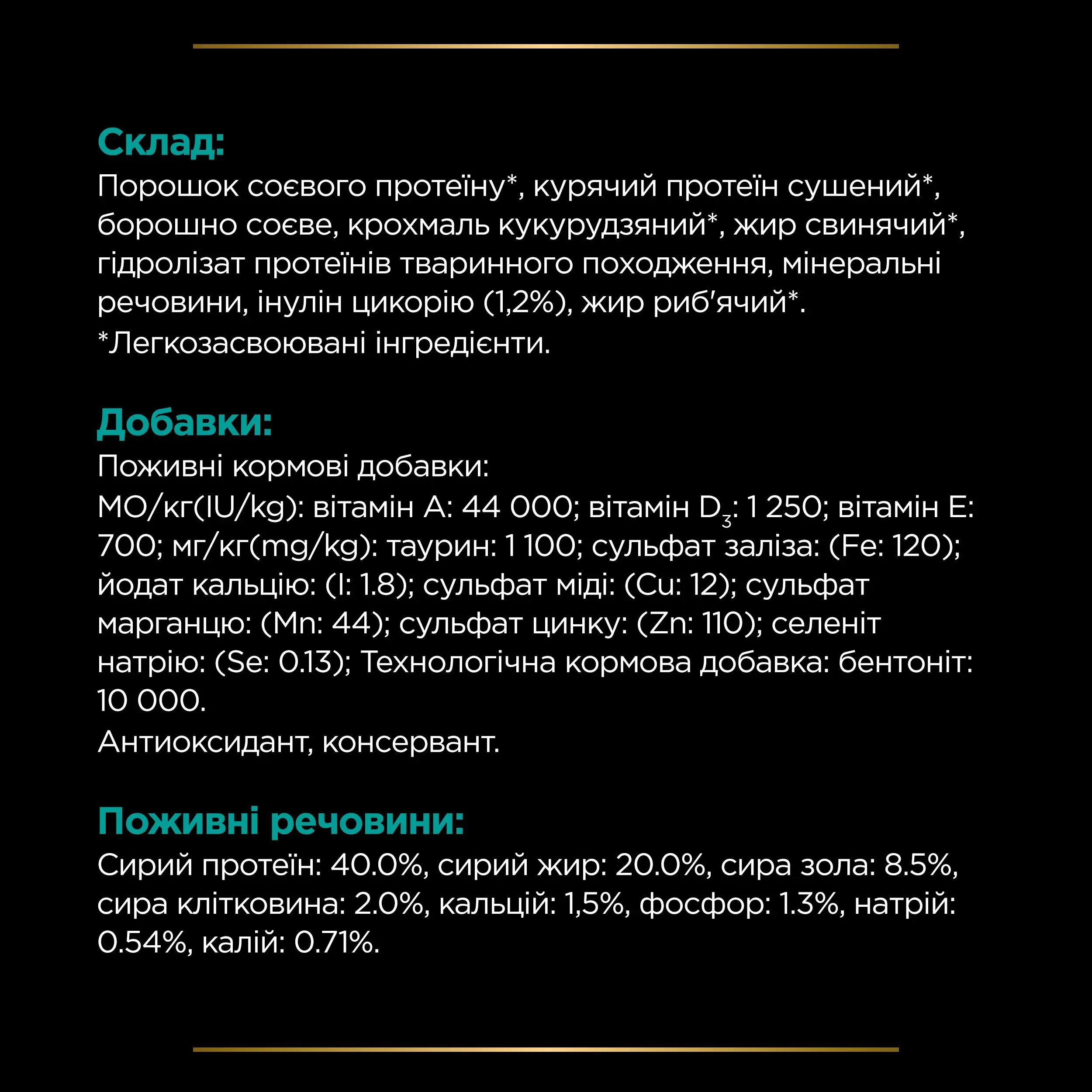 Ізолят соєвого білка*, дегідратований курячий протеїн*, борошно соєве, крохмаль кукурудзяний*, жир тваринний*, дігест, вітаміни та мінеральні речовини, інулін (мін. 0.2%), жир риб’ячий*, антиоксиданти (пропілгаллат, бутил гідрооксианізол), холін хлорид, таурин, DL-метіонін, фосфорна кислота. *Легкозасвоювані інгредієнти.
