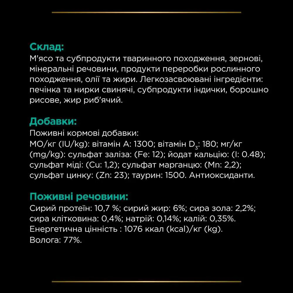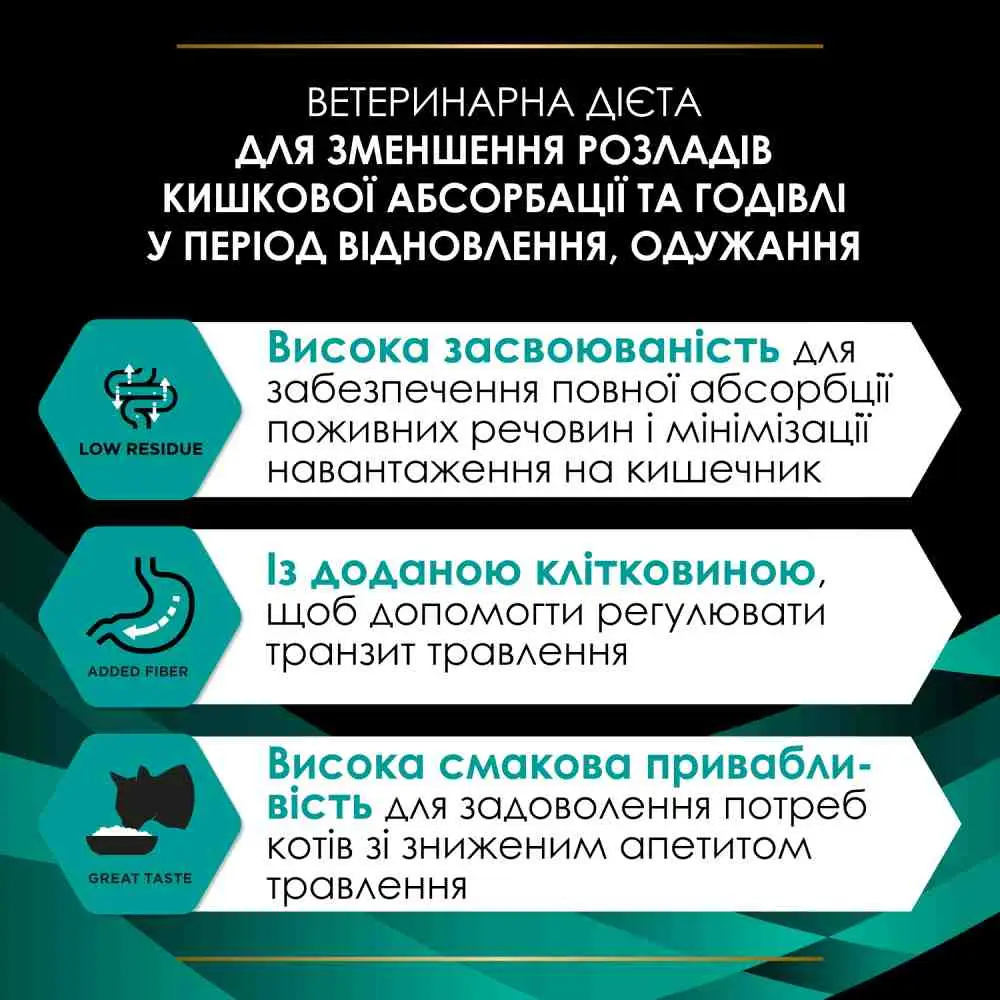 Цей повноцінний корм для дорослих котів і кошенят, розроблений фахівцями Purina, допоможе боротися зі шлунково-кишковими розладами та хронічними захворюваннями печінки (без енцефалопатії). Він сприяє зменшенню порушень всмоктування в кишківнику і допомагає у відновленні харчування та одужанні. Крім того, цей корм ефективний навіть у випадках хронічної неспецифічної діареї.