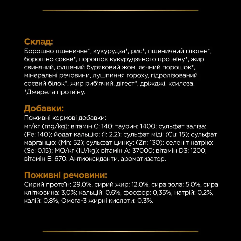 Борошно пшеничне, кукурудза, рис, пшеничний глютен, борошно соєве, порошок кукурудзяного протеїну, жир свинячий, сушений буряковий жом, яєчний порошок, мінеральні речовини, лушпиння гороху, гідролізований соєвий білок, жир риб’ячий, дігест, дріжджі, ксилоза, джерела протеїну, мг/кг (mg/kg): вітамін С: 140, таурин: 1400, сульфат заліза: (Fe: 140), йодат кальцію: (І: 2.2), сульфат міді: (Cu: 15), сульфат марганцю: (Mn: 52), сульфат цинку: (Zn: 130), селеніт натрію: (Se: 0.15), MO/кг (IU/kg): вітамін А: 37000, вітамін D3: 1200, вітамін Е: 670, антиоксиданти, ароматизатор, поживні речовини, сирий протеїн: 29.0%, сирий жир: 12.0%, сира зола: 5.0%, сира клітковина: 3.0%, кальцій: 0.6%, фосфор: 0.35%, натрій: 0.2%, калій: 0.8%, Омега-3 жирні кислоти: 0.3%.