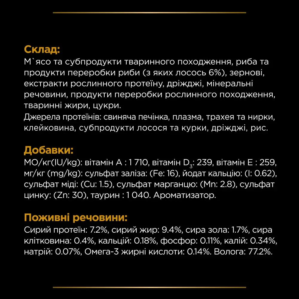 Склад: М’ясо та субпродукти тваринного походження, тваринний жир, риба та продукти її переробки (з яких лосось 5%), зернові, екстракти рослинного протеїну, дріжджі, мінеральні речовини, амінокислоти (метіонін, L-цистеїн, гліцин), продукти переробки рослинної сировини, загусники (гуарова та ксантанова камеді), цукри, вітаміни, антиоксиданти.