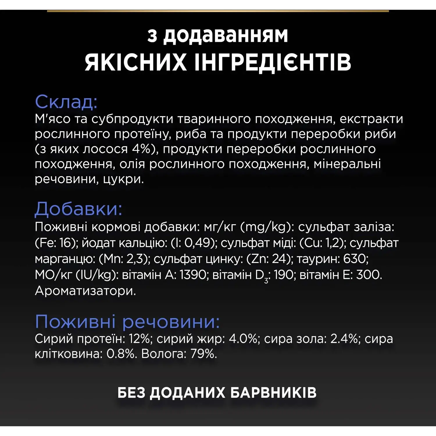 М’ясо та субпродукти тваринного походження, екстракти рослинного протеїну, риба та продукти переробки риби (з яких лосося 4%), продукти переробки рослинного походження, олія рослинного походження, мінеральні речовини, цукри