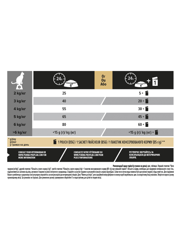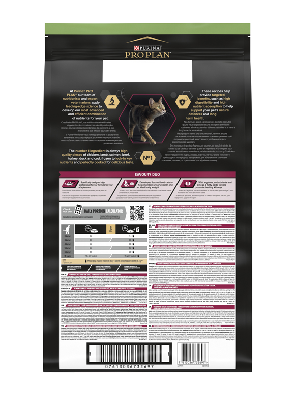 У Purina Pro Plan команда дієтологів та досвідчених ветеринарів застосовує передові досягнення науки для розробки нашого збалансованого та ефективного поєднання поживних речовин для вашого вихованця. Наші раціони мають ряд властивостей, таких як висока засвоюваність та високе поглинання поживних речовин, щоб підтримати природний захист вашого улюбленця та його довгострокове здоров’я. Такі інгредієнти як курка, ягня, лосось, індичка, качка, тріска та яловичі субпродукти попередньо заморожені для збереження ключових поживних речовин та приготовані для відмінного смаку.