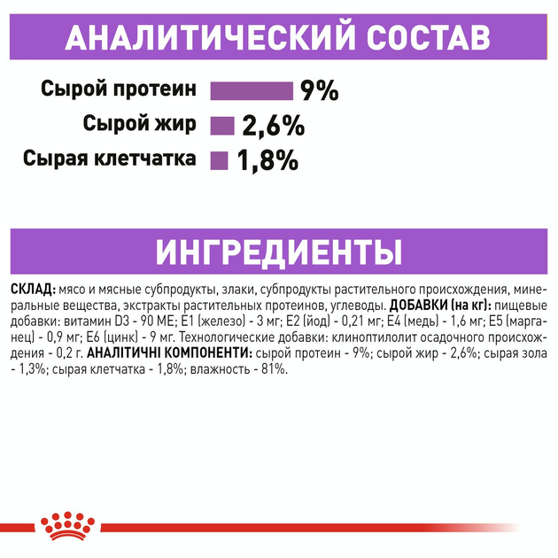 сирий протеїн – 9%; сирий жир – 2,6%; сира зола – 1,3%; сира клітковина – 1,8%; вологість – 81%.