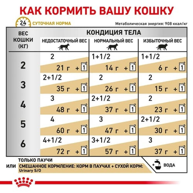 Перед початком споживання слід проконсультуватися з ветеринарним лікарем. Годування кормом Urinary S/O від 5 до 12 тижнів для розчинення струвітних каменів. Для попередження рецидивів уролітіазу курс лікування слід продовжувати ще не менше 6 місяців, при цьому необхідно регулярно проводити аналізи сечі. Після одужання рекомендується регулярний огляд у ветеринарного лікаря, за необхідності корм може бути призначений на все життя. Пам’ятайте, що тварині слід забезпечити постійний доступ до питної води.