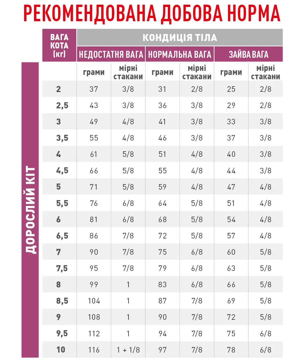 Спосіб вживання: див. таблицю. Корм готовий до вживання. Слідкуйте, щоб у вашого кота завжди була свіжа вода. Номер серії, реєстраційний номер заводу-виробника та термін придатності зазначені на упаковці. Зберігати у сухому, прохолодному місці.