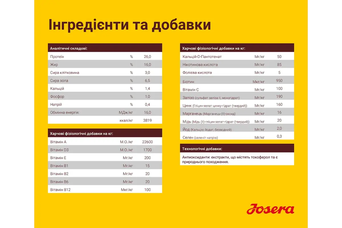 Аналітичний склад: протеїн 26.0 %, жир 16.0 %; сира клітковина 3.0 %, сира зола 6.5 %, Кальцій 1.4 %, Фосфор 1.0 %, Натрій 0.4 %.