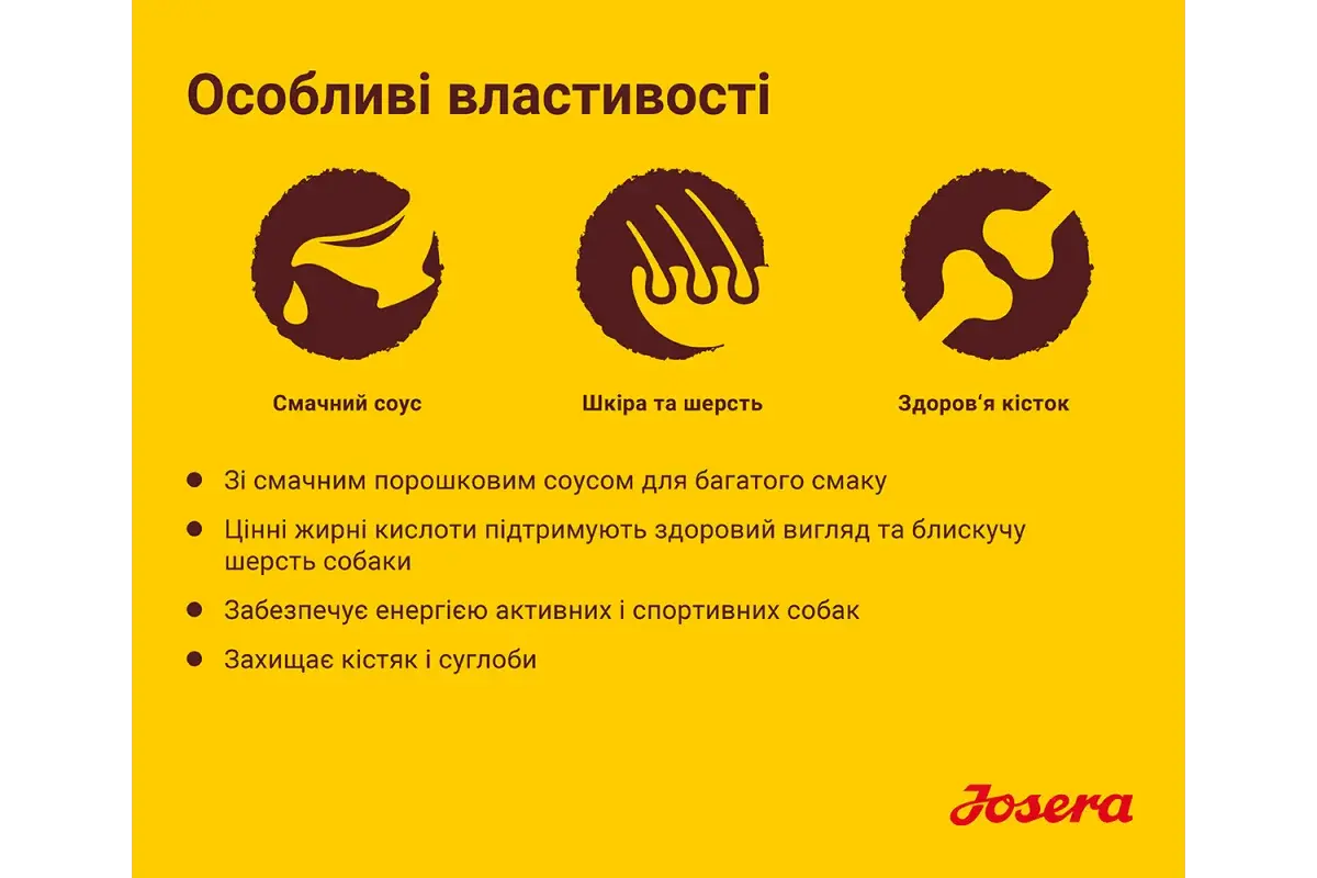 Josera Festival неповторне меню для наших вибагливих гурманів: цей корм можна давати як сухим, так і вологим. Завдяки інтегрованому порошковому соусу та додаванню води хрусткі крокети перетворюються на дуже особливі смаколики! така зміна корму переконує наших вибагливих улюбленців. Відмінна рецептура доповнена м’ясом лосося. Виготовляється в Німеччині та проходить ретельну перевірку у власній акредитованій лабораторії. Корм містить високоякісні, здорові та натуральні інгредієнти, які не є генетично модифікованими. БЕЗ додавання консервантів, штучних барвників та ароматизаторів. Сухий корм для собак Josera не випробовується на тваринах. БЕЗ додавання пшениці, сої, цукру і молочних продуктів.