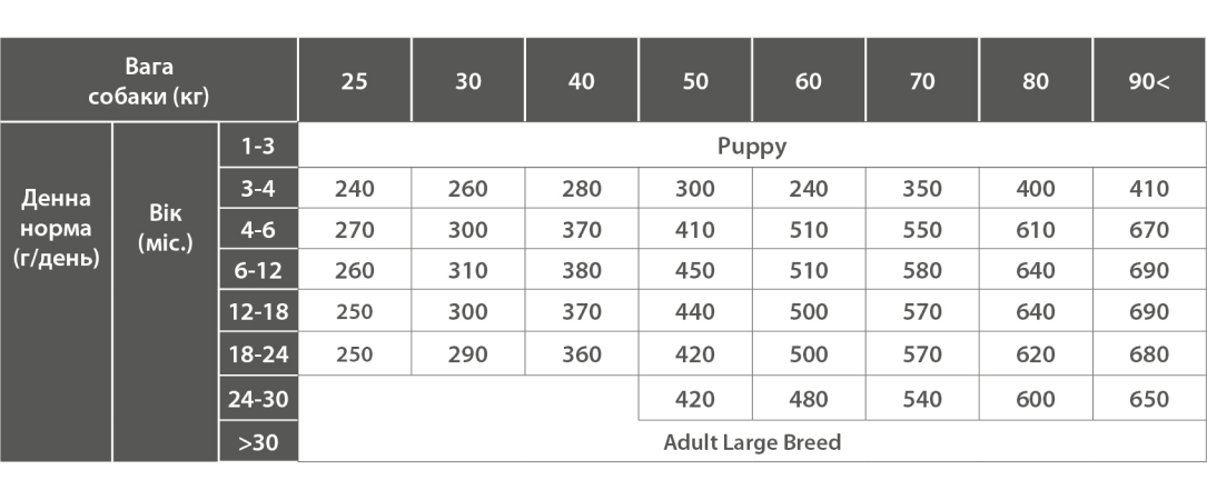 | Розмір тварини | Великі породи (25 – 50 кг доросла собака), Гігантські породи (понад 50 кг доросла собака) |