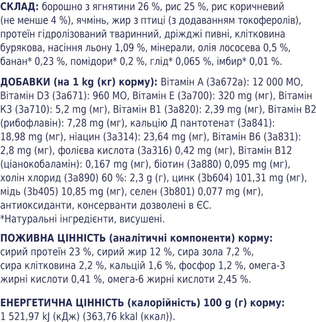 Гарантовані показники: сирий протеїн — 23%, сирий жир — 12%, сирий попіл — 7,2%, сира клітковина — 2,2%, кальцій — 1,6%, фосфор — 1,2%, омега 3 жирні кислоти — 0,41%, омега-6 жирні кислоти — 2,45%.