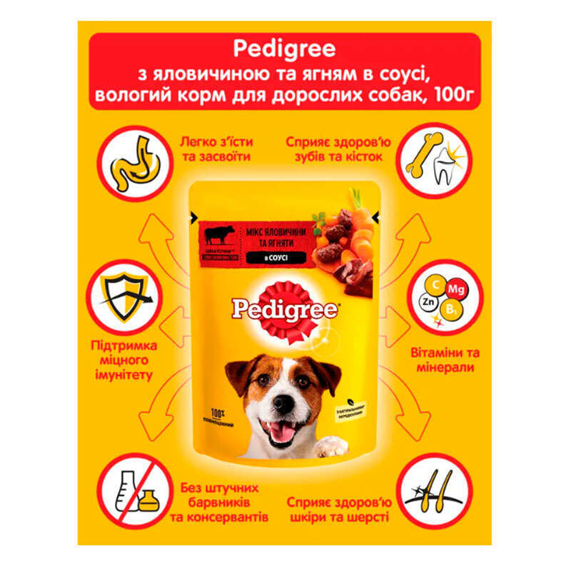 Консерви Педігрі з яловичиною та ягням не містять шкідливих харчових добавок: ароматизаторів, барвників, консервантів. До складу корму входить клітковина та інші інгредієнти, що покращують травлення. Консерви насичують організм собаки всіма необхідними поживними речовинами, вітамінами та мікроелементами, що сприяють активізації обміну речовин, зростанню шерсті та покращенню апетиту.
