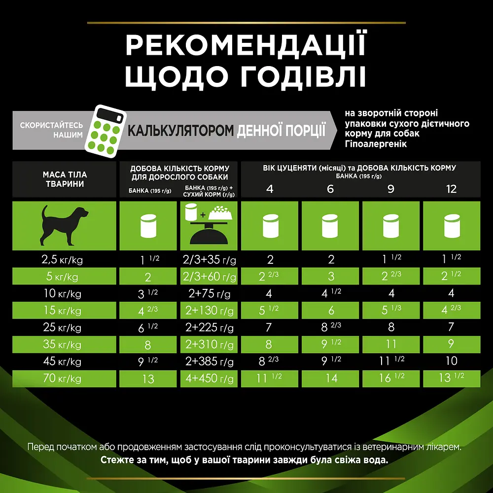 - Перед початком або продовженням терміну використання корму, а також для отримання рекомендацій щодо годування цуценят, рекомендується консультація ветеринарного лікаря.