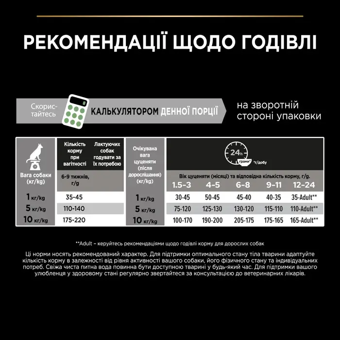 Рекомендації по годівлі: з 3 по 6 тиждень починайте давати розмочений корм Pro Plan® 3-4 рази на день. Після повного припинення годування материнським молоком, годуйте згідно таблиці. При досягненні трьохмісячного віку, поступово знижуйте кількість води, доданої для розмочування корму. Підтримання оптимальної маси тіла дуже важливо для здоров’я вашого цуценя. Рекомендована добова норма може варіюватися в залежності від рівня активності, фізичних особливостей і індивідуальних потреб вашого цуценя. слідкуйте щоб у собаки завжди була чиста, свіжа питна вода. Для контролю здоров’я вашого собаки звертайтесь у ветеринарну клініку на регулярній основі.