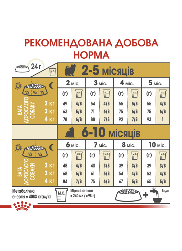 Рекомендації щодо годівлі: ці норми мають рекомендований характер. Для підтримки оптимального стану тіла тварини адаптуйте кількість корму в залежності від рівня активності вашого собаки, його фізичного стану та індивідуальних потреб. Свіжа чиста питна вода повинна бути доступною тварині у будь-який час. Для підтримки вашого улюбленця у здоровому стані регулярно звертайтеся за консультацією до ветеринарних лікарів.