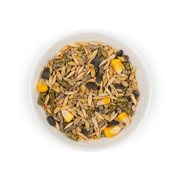 Овес, пшениця, трав’яне борошно в гранулах 6 мм, гречка, ячмінь, горох, насіння соняшника, комбікорм, трав’яне борошно в гранулах 4 мм.