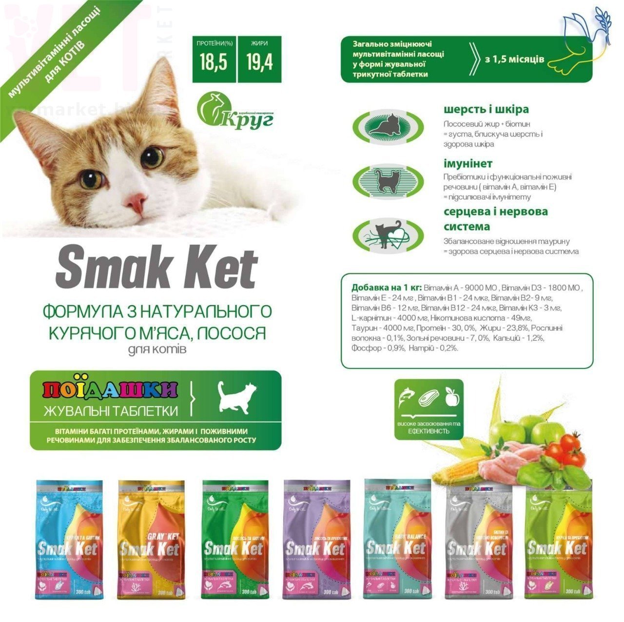 Мультивітамінна харчова добавка для котів Smak Ket КУРКА І БІОТИН є, одночасно, і вітамінами, і смачними ласощами для Вашого вихованця. Зроблені у вигляді привабливих жувальних таблеток, які містять весь список необхідних вітамінів і амінокислот для гарного самопочуття і настрою. Відрізняються високим поїданням і можуть використовуватися для ігор і заохочення.