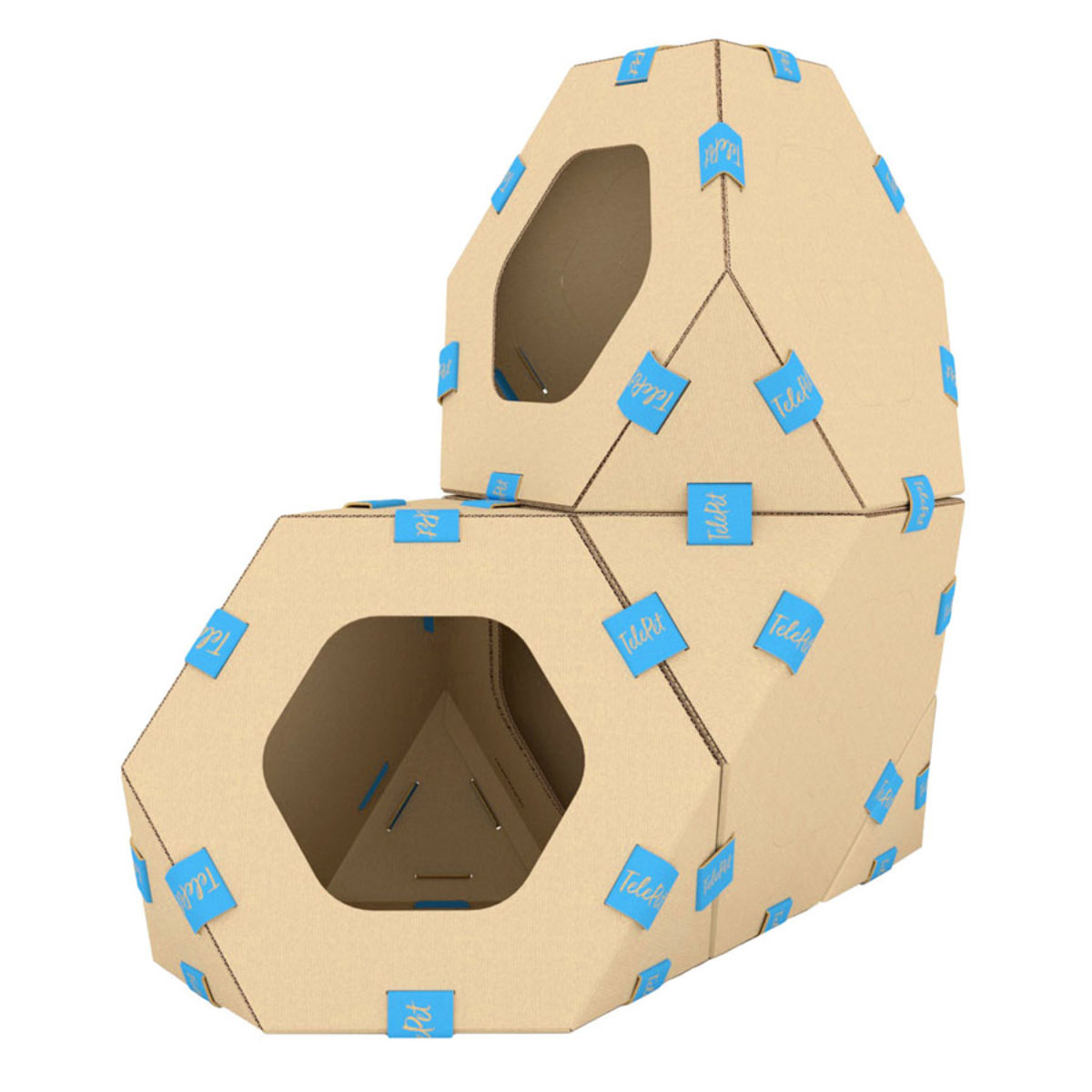 Модульний будиночок TelePet виготовлений із тришарового екологічно чистого картону. Він простий у складанні, компактний і відрізняється приємним оригінальним дизайном. Конструкція виробу дозволяє поєднувати між собою необмежену кількість будиночків, перетворюючи звичайне спальне місце на багатофункціональний комплекс, де кіт може гратися і відпочивати.