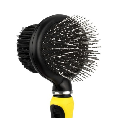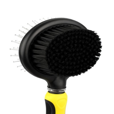 Щітка масажна необхідна для щоденного догляду за вовною собак та котів. Цей інструмент має робочі поверхні з двох сторін. З одного боку гребінець масажер для розчісування шерсті, а з іншого боку щетиниста щітка для видалення з поверхні тіла тварини вичесаної шерсті. Ергономічна ручка виконана із протиковзкого матеріалу. Цей інструмент при необхідності швидко приведе шерсть тварини у охайний зовнішній вигляд.