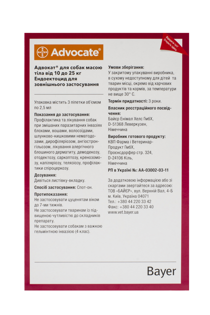 Краплі Elanco (Bayer) Advocate (Адвокат) від заражень ендо та екто паразитами для собак 10-25 кг 3 піпетки