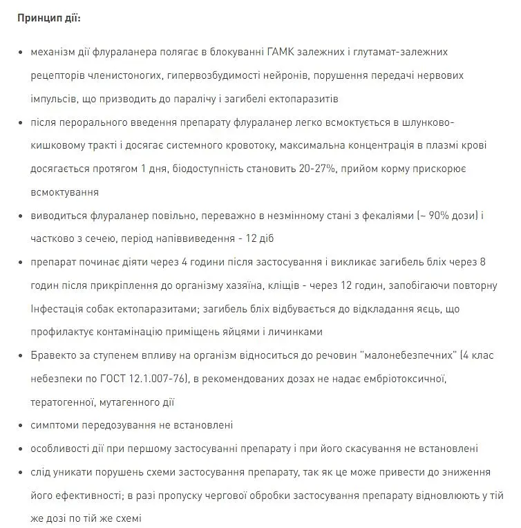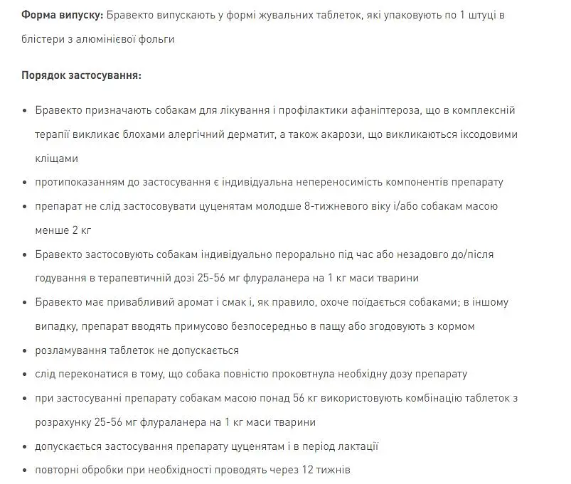 - Bravecto застосовують для собак індивідуально перорально під час або незадовго до чи після годування в терапевтичній дозі.